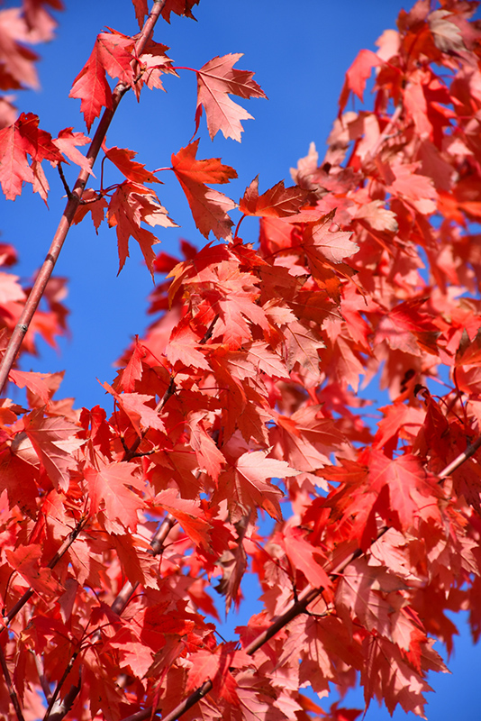 An impressive large shade tree valued for its brilliant crimson red color in fall, showy red flowers along the bare branches in early spring, a hybrid that combines the soil tolerance of silver maple with the colors of the red maple