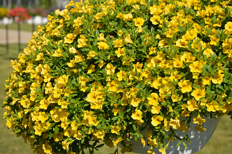 Cabaret® Deep Yellow Calibrachoa will grow to be about 10 inches tall at maturity, with a spread of 18 inches. When grown in masses or used as a bedding plant, individual plants should be spaced approximately 12 inches apart. Its foliage tends to remain low and dense right to the ground. This fast-growing annual will normally live for one full growing season, needing replacement the following year.