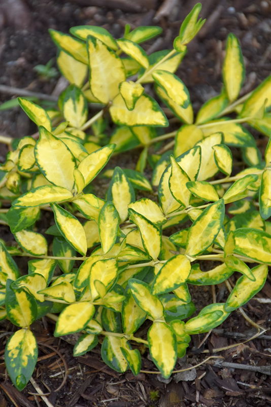 A breathtakingly colorful evergreen groundcover featuring rich lavender flowers held over very glossy yellow-variegated foliage that colors the whole garden; does well in sun or deep shade, quickly forms a dense mat, even grows well under trees