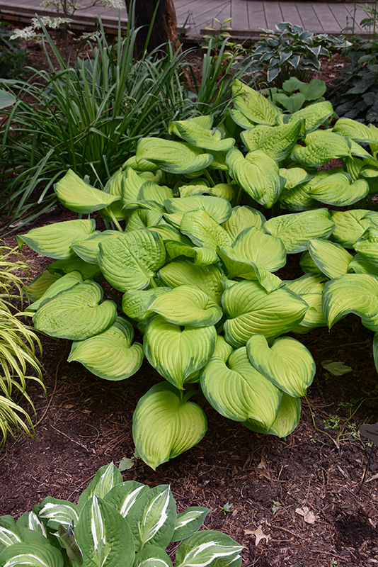 Leaves have chartreuse centers with green variegation and wavy margins; provides beautiful texture and contrast to other plants; fragrant white spikes of flowers in mid-summer